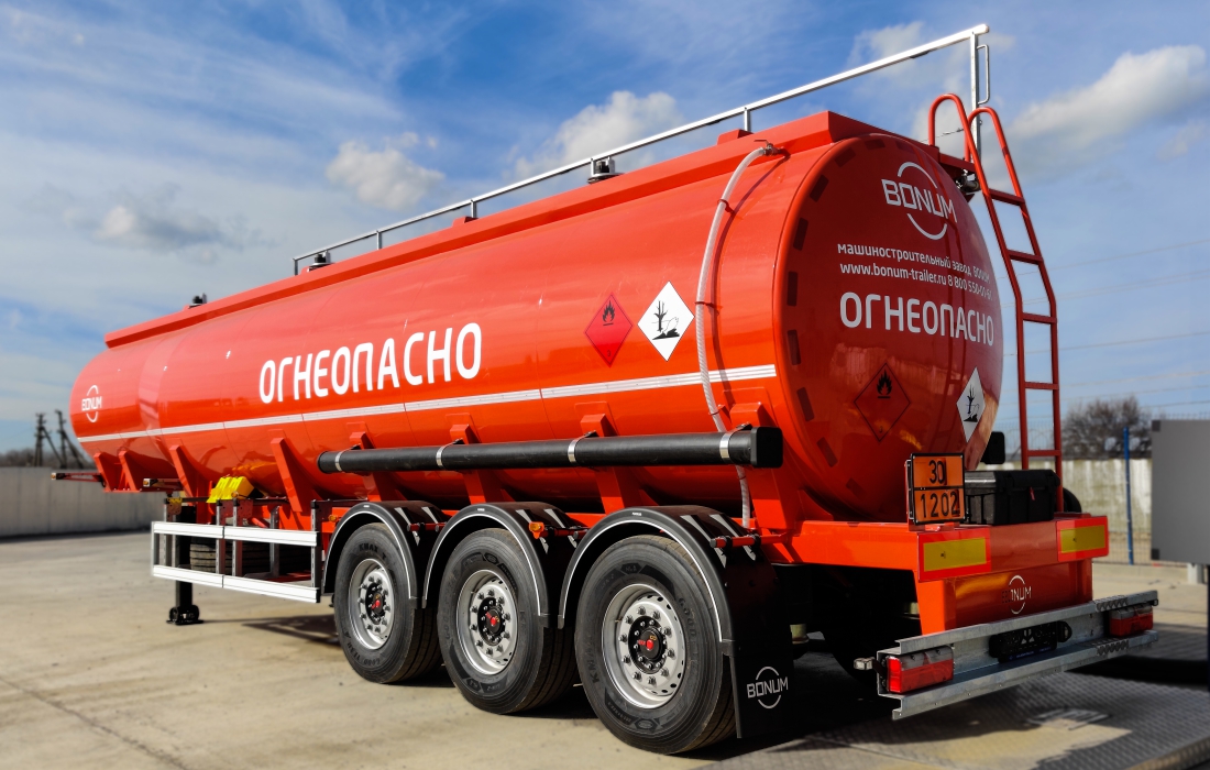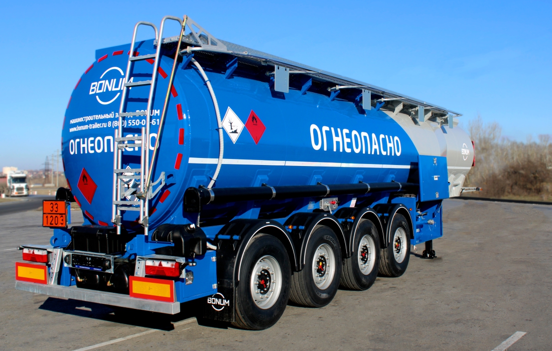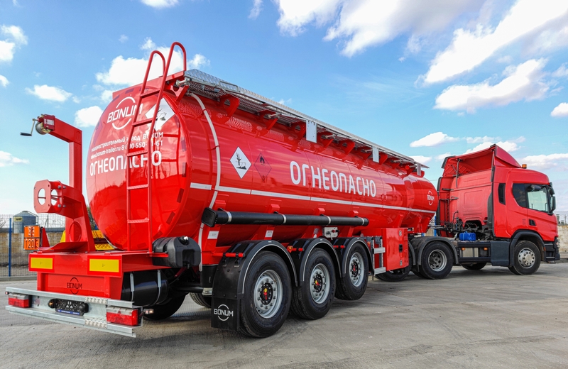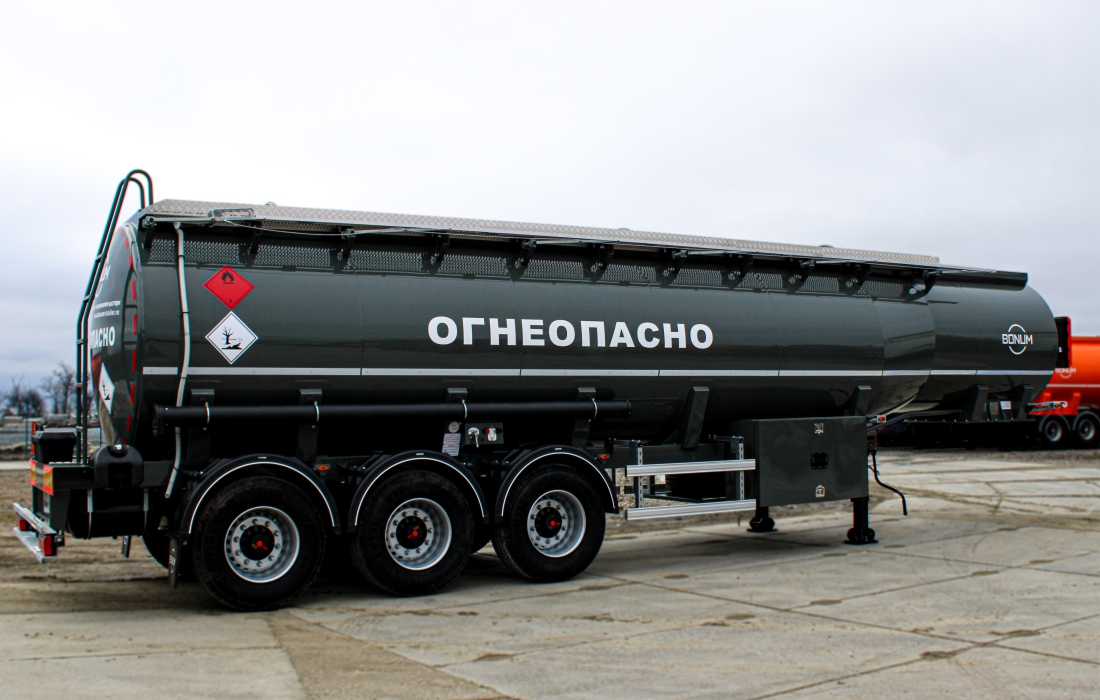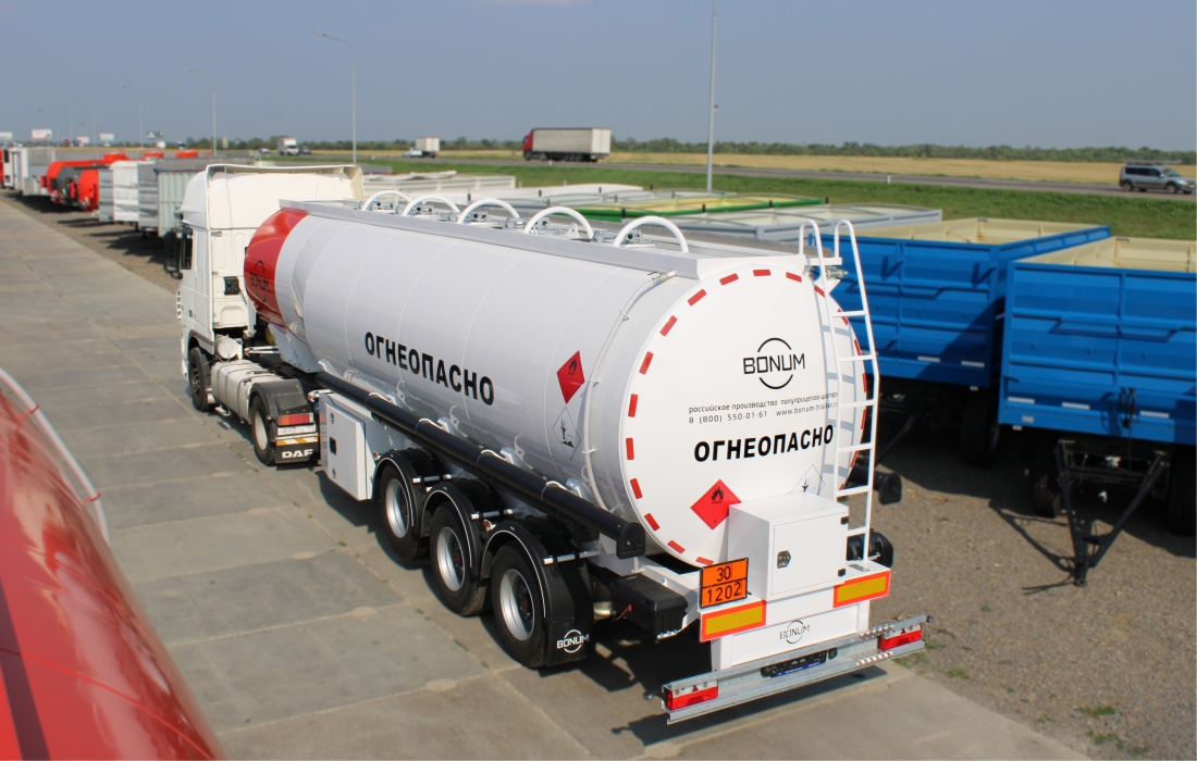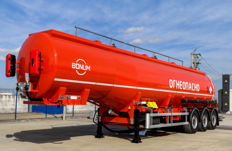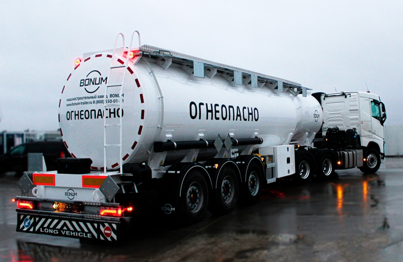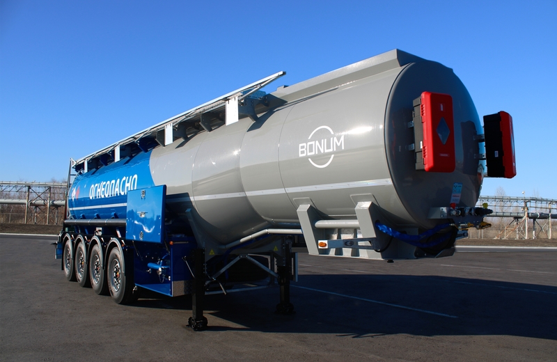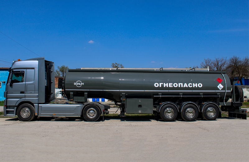 Полуприцеп-цистерна BONUM для перевозки бензина, керосина, дизельного топлива, нафты и других светлых нефтепродуктов. Европейские комплектующие, большой выбор дополнительных опций: от установки системы Wabco Opti Link до нижнего налива. Есть модификации полуприцепа на четырех осях, которые дают возможность перевозить максимальный объем нефтепродуктов за счет снижения нагрузки на каждую ось.