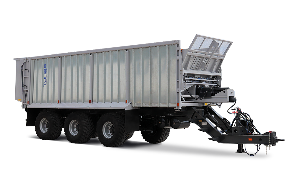 Тракторный прицеп Тонар-БС17 предназначен для перевозки органических удобрений и сельскохозяйственных грузов. Гидравлическая передняя стенка кузова позволяет подпрессовывать силос и сенаж для увеличения перевозимого объема. Регулируемая по высоте сцепная петля дает возможность подобрать оптимальное сцепное устройство. Усиленная рессорная подвеска позволяет перевозить одновременно до 30 тонн груза.1 и 3 оси подруливающие.